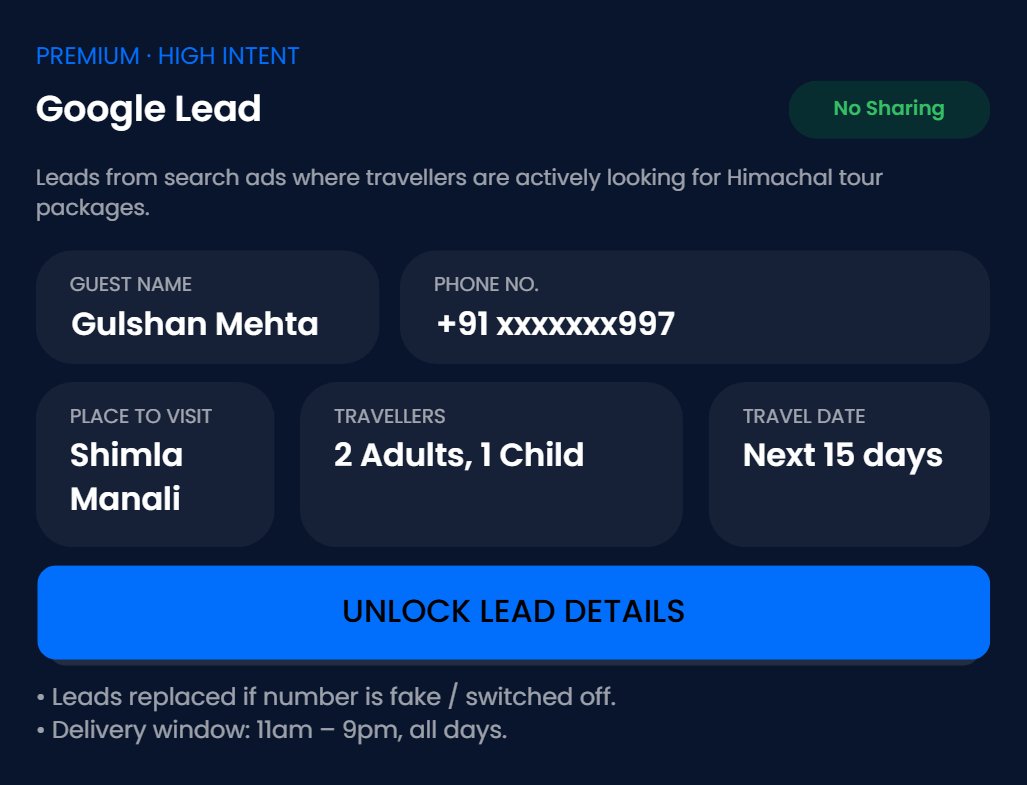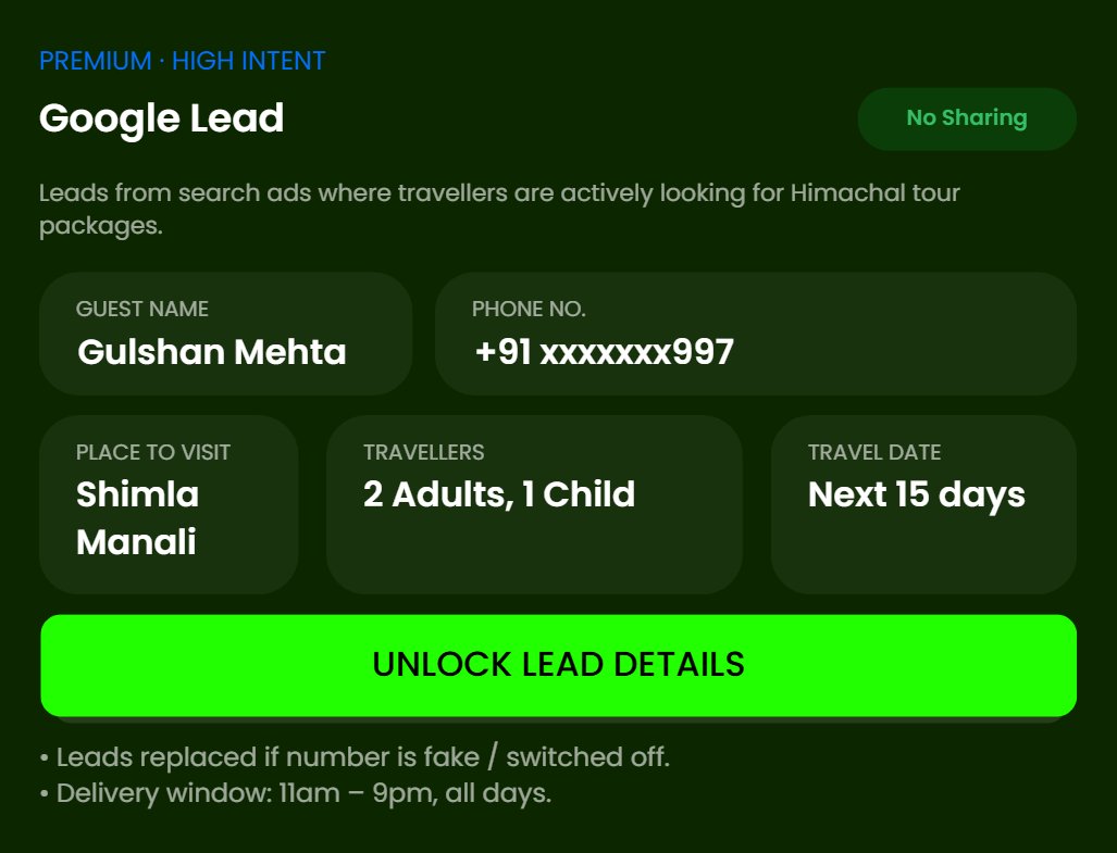Stop wasting ad budget on cold traffic. Get fresh, verified Himachal trip enquiries everyday and only pay for the leads you actually want to work.